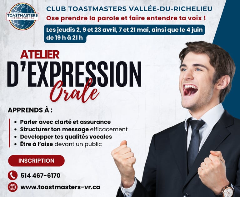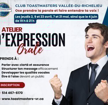 Le Club Toastmasters Vallée-du-Richelieu t’offre un atelier concret en 6 séances pour développer ton aisance à l’oral, dans un environnement dynamique et bienveillant.